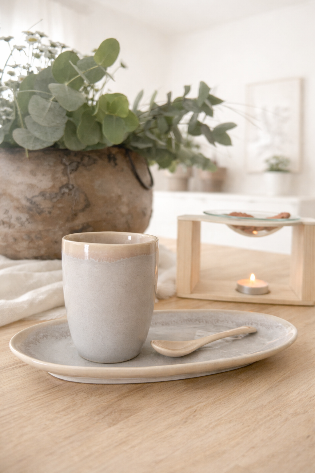 Das Set besteht aus einem ovalen Teller, einem Kaffee-Becher und einem Löffel.